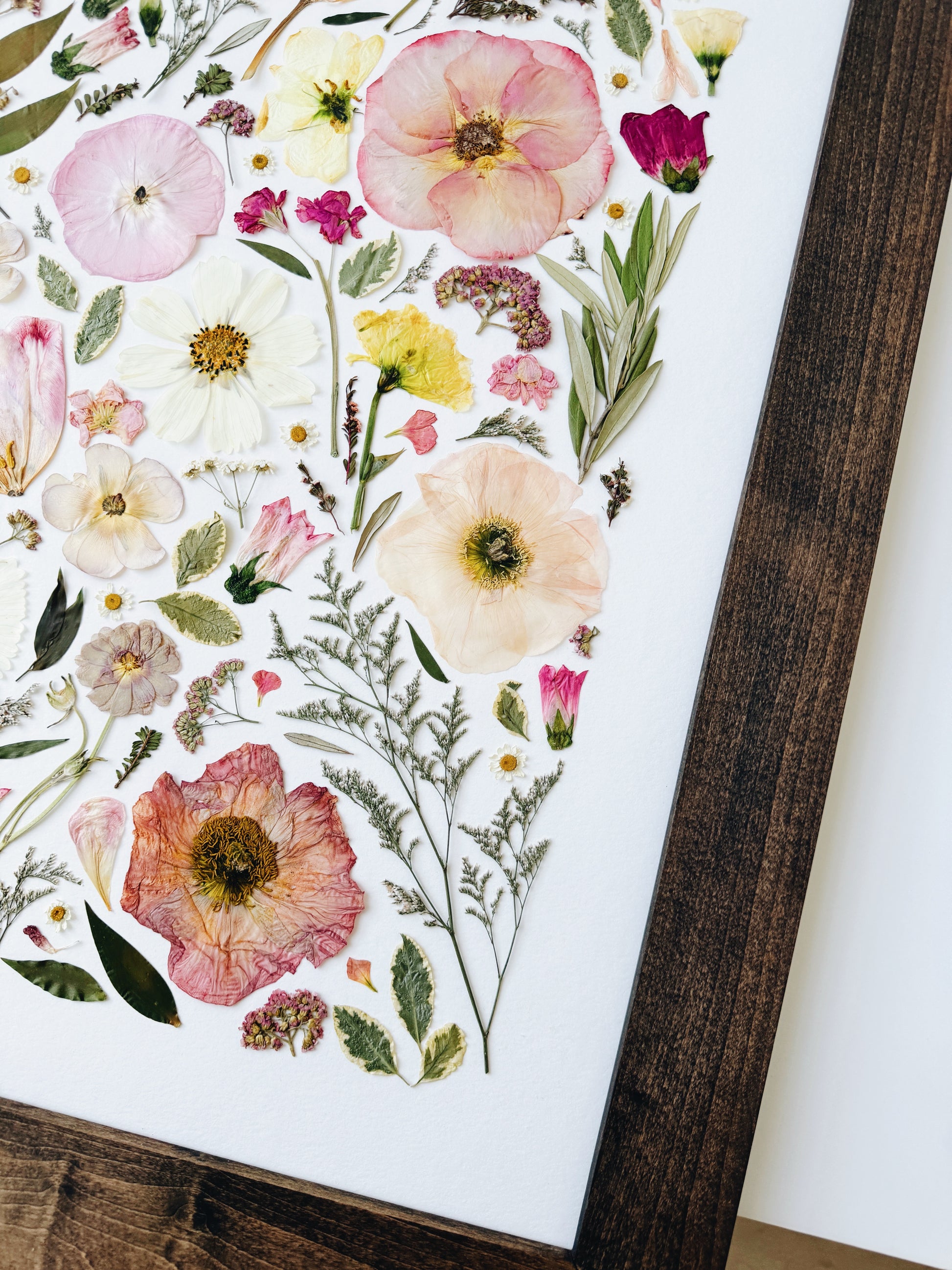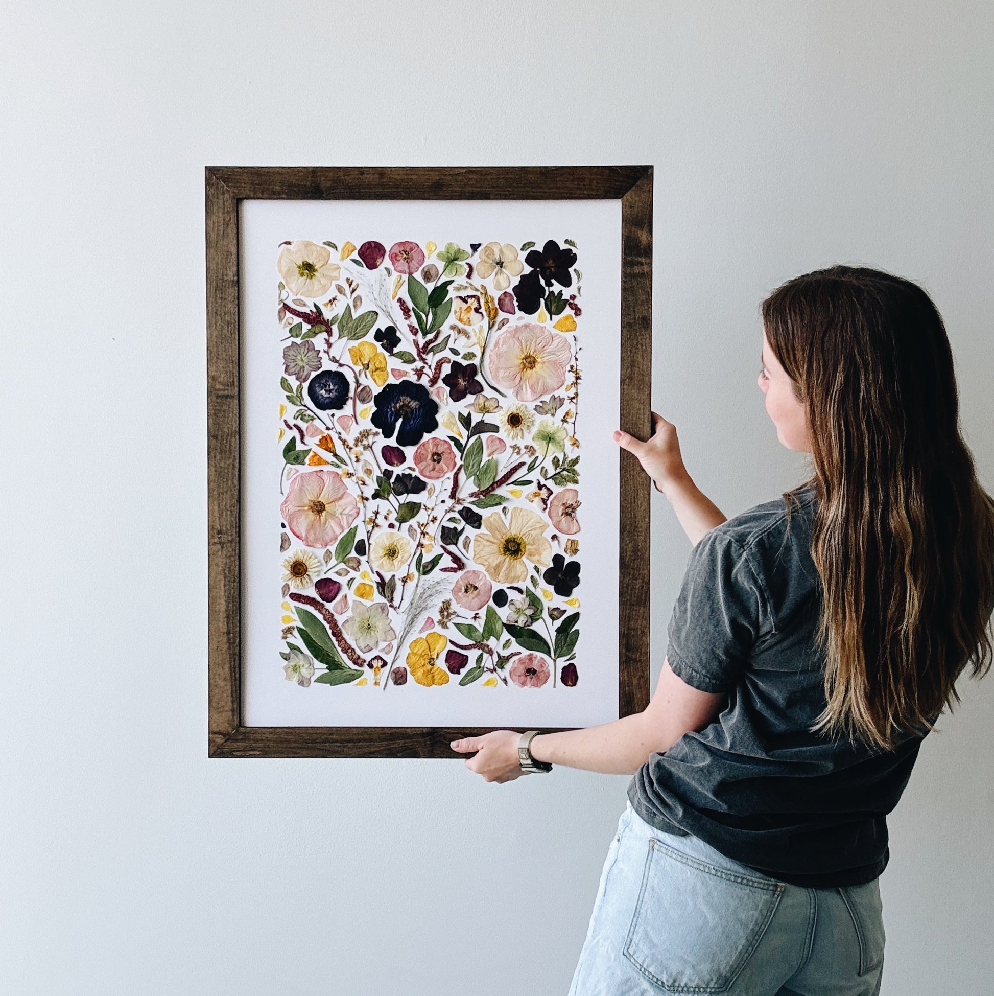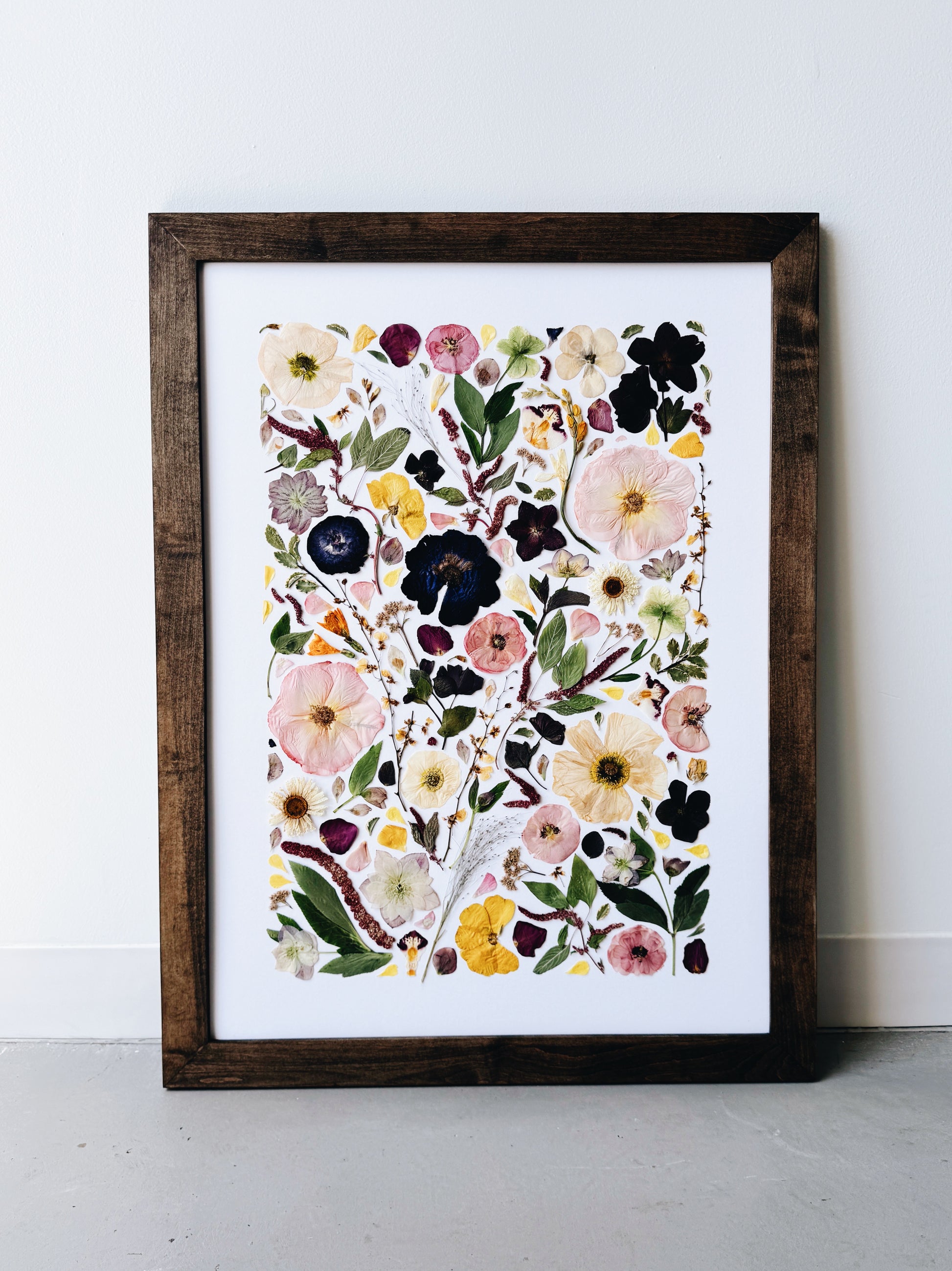 This 22x30' is our largest standard frame size that we offer! This design meticulously lays out your flowers to create a beautiful display of the deconstructed arrangement elements with a thicker frame. Lots of small details and meticulously placed petals! This style allows you to choose a glass background or black/white archival paper backing to help each tiny piece stand out. Our preservation pieces not only allow you to hold onto your flowers forever, but you get to admire them every day as a true piece of art!