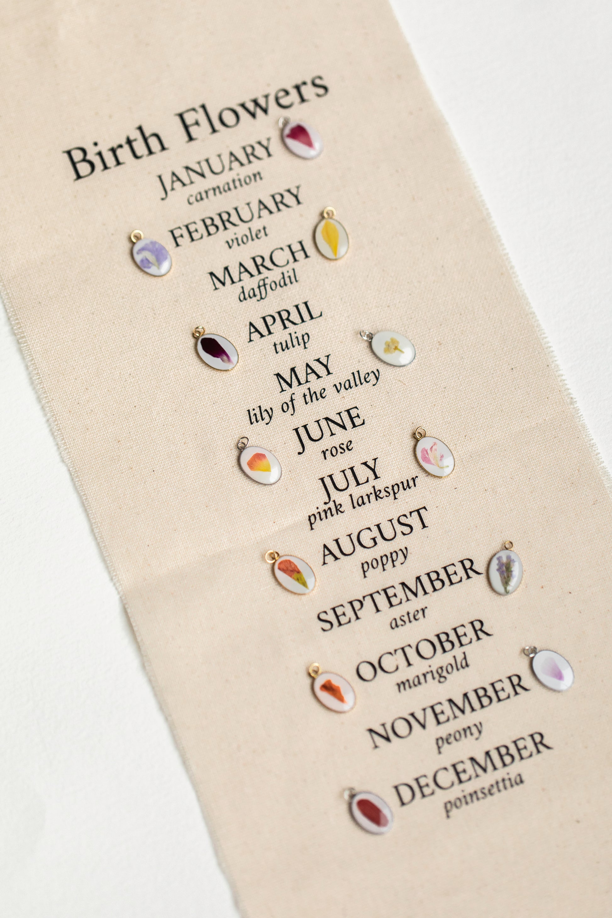 Each pendant features a real, pressed flower representing its birth month—preserved in clear resin for a long-lasting finish. Choose a gold or silver chain and add one charm or multiple birth-month charms on a single necklace; just note your selections.
